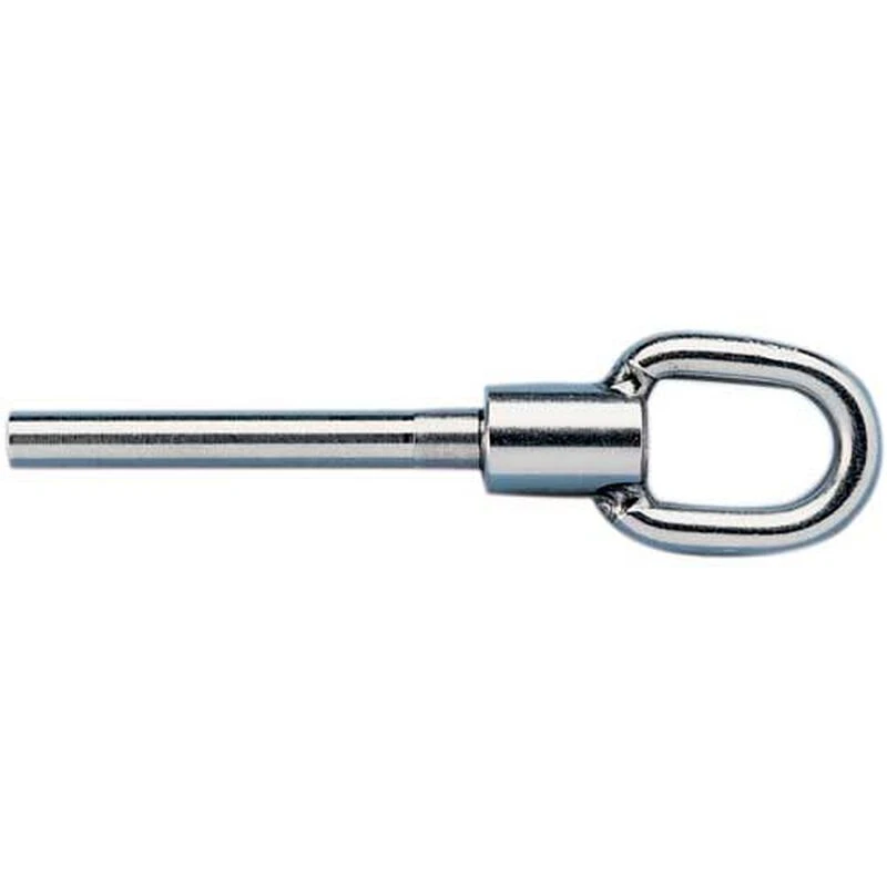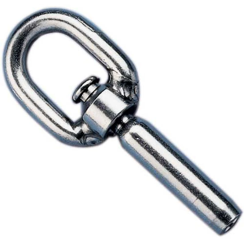 C. Sherman Johnson gate eye terminals are constructed using 316 stainless steelโan ideal blend of strength and corrosion resistance for marine lifelines. Available in a swivel or threaded version provide an attachment point for pelican hooks. The swivel eye allows the lifeline to move independently of the lifeline gate, but requires installation starting at the gate. The threaded version will allow the lifeline to be installed from any direction, but links the lifeline and gate together. Both versions require professional installation using a machine swager.