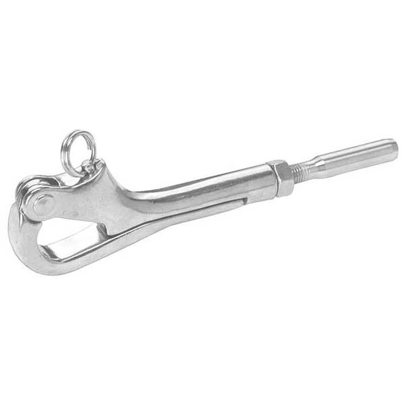 These positive locking pelican hooks can be installed easily on your boat with any hand swaging tool. They are investment cast from 316 stainless steel with lifeline swage studs. Electro-polished. Pelican hooks in the smaller size, with a 3 1/4″ closed length, are not for tensioning.