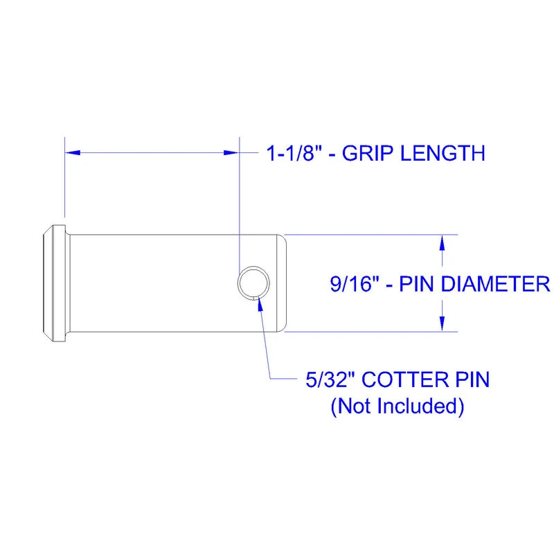 Hayn clevis pin, 9/16″ dia. with a grip length of 1 1/8″. Hayn clevis pins are manufactured from marine-grade corrosion-resistant 316 grade stainless steel. The CP916118 clevis pin utilizes a 3/16” X 1 1/2” cotter pin for retention (sold separately).